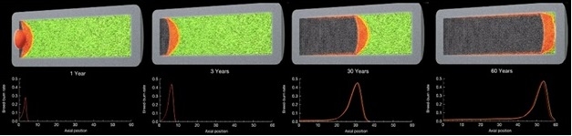 (圖一)行波反應爐的運作原理。行波反應爐就像一支雪茄,有一個圓柱體,這就是核分裂材料的管,然後在一端點亮它。然後就像雪茄一樣,發生核分裂的一端就是發光區橘色處,灰色的部分則是灰燼區,分裂後的一端。 資料來源:比爾蓋茲談能源 : 至零方休的革新!
