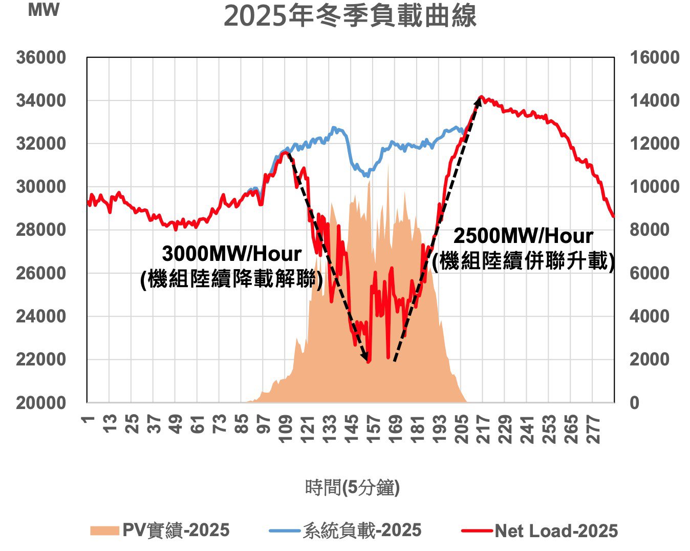 2025年,離岸風電已經興建完成,集中在中部彰濱外海,這些風力發電會併入中部電網;而太陽光電裝置容量20GW也早已上工,集中於中南部地區,多併入南部電網。冬季的東北季風,加上穩定的日照,大量且具高度集中性的再生能源併入區域的電網,且為了讓綠電先行,在過年期間用電需求大減下,大多數傳統機組勢必得減少發電運轉甚至是解聯,這時再生能源的發電占比將是最高的時候,少了傳統機組提供的輔助服務及轉動慣量,如遭遇到再生能源發電大幅變動或是設備故障,將導致電力系統的穩定運轉產生衝擊,最慘的情況是頻率持續下探就像煞不住的卡車,你我就被無預警的停電了。