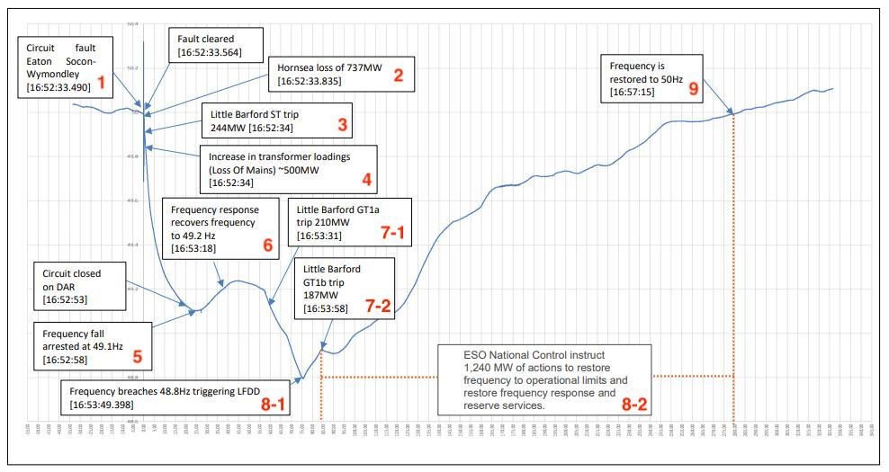其中太陽能於當日中午約12:30達到當日發電量尖峰的6GW,低於當時英格蘭和威爾斯系統的負載需求約25GW。下午4點52分33秒的其中一個雷擊擊中某個400kV超高壓輸電電塔;雖然電塔保護系統迅速自我排除事故,但影響到配電系統崁入式電源主饋線喪失(Loss of Main, LoM)的電壓向量位移保護(vector shift protection)電驛動作跳脫約150MW發電出力。
