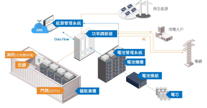 模組廠在製作模組時,會建立第一層小型電池管理系統(Battery Management Unit, BMU),它必須一直蒐集電池模組的電壓、電流、容量、溫度等資訊,來評估電池現在的健康程度,並將消防防護機制也設計在內,以防止電池芯之間的延燒。第二層就是電池管理系統BMS,判斷現有電池容量還可以使用多長時間,若使用過量會影響其他電池模組正常運作,這時BMS會啟動保護機制,停止供電或充電,來保護整個電池機櫃的安全。