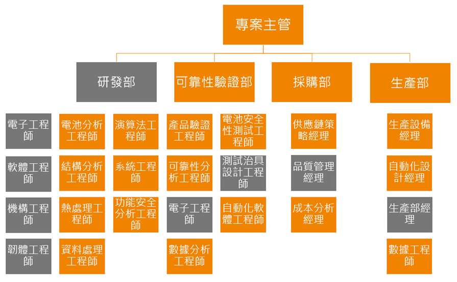 接著,我們來看什麼樣的公司組織架構設計,可以最大程度提高打擊率。下圖是一間健康的電池公司關鍵部門需要的人才標配,電池公司可以做動力電池及儲能電池,兩者需要的技術特性稍有不同,因此組織架構設計也會稍有不同,我們今天先談動力電池,以後有機會我們再寫一文談儲能電池的組織架構設計。灰色底的是大部分電池公司都已經配備的人才,橘色底的是大部份公司缺乏的人才,我們認為其中有三種人才最關鍵: