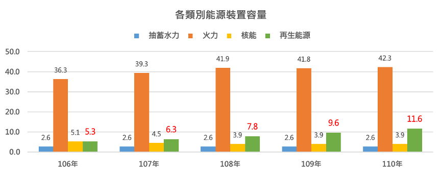 臺灣能源轉型以減煤、增氣、展綠、非核之潔淨能源發展方向為規劃原則,目前我們使用約5.4%的再生能源,而且還在持續增加中。風力及太陽光電裝置容量從民國106年至110年共增加約6.3 GW,已經遠超過台中火力發電廠整廠容量,核一、核二、核三總裝置容量5.1 GW,也與台中火力發電廠不相上下。