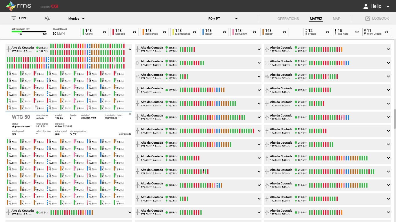 接著,第二個工作就是運轉,目的是維持穩定與安全。在同一個平台上,即時系統可以看出單一或全數案場機組的電壓、頻率、線路壅塞等狀況,和電力公司進行通訊建置之後,彼此資料還可以同步連結與共享,最後還可以產出運轉資訊報表。