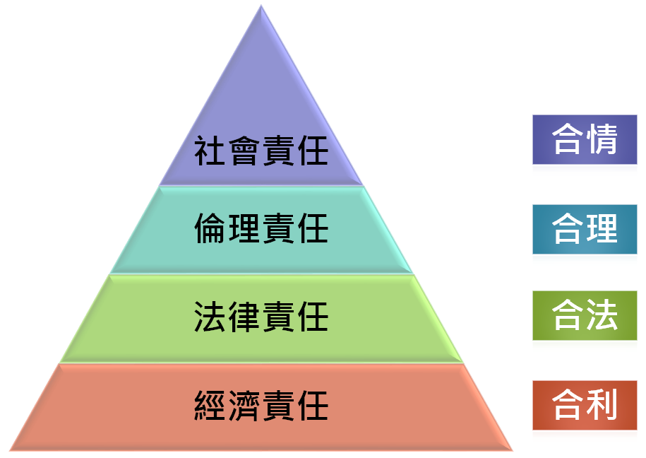 2. 企業追求永續及面對氣候變遷的的模式,不是一蹴可及,會在過程當中不斷省思與發現自我,從眼前看到更遠,通常分為四個階段:經濟責任→法律責任→倫理責任→社會責任,翻成白話文則是:合利→合法→合理→合情。當企業眼光放得更遠時,不再只看到眼前,而能夠看到企業對於氣候變遷可避免的風險,更能夠看到未來的機會