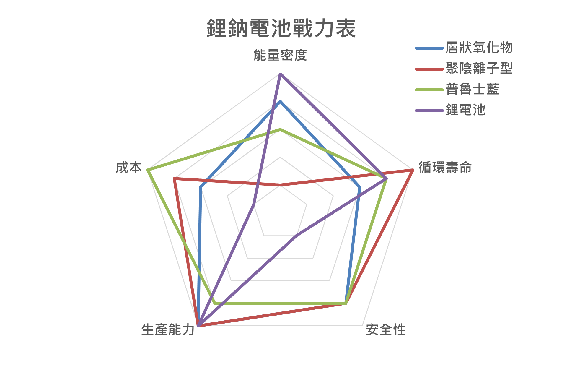 (圖一)鈉電池不同的正極材料路線與鋰電池的戰力表