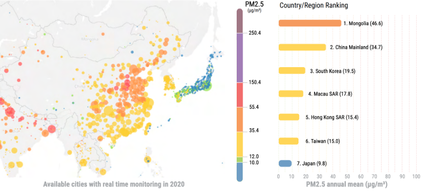 2014年3月世界卫生组织公布「空气污染是人类健康最大的环境威胁之一,每年造成700万人提早死亡」,2021年9月进一步加严空气品质指南,将PM2.5的浓度改善最终目标定为每日15μg/m3,年度平均最终目标为5μg/m3。