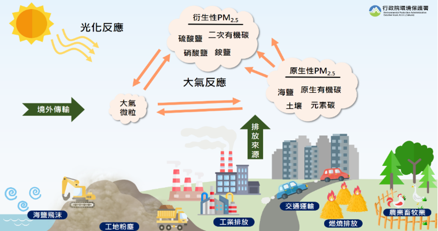 根据环保署统计,台湾最常见的PM2.5来源主要来自火力发电厂、工厂、汽机车与露天燃烧。在人口密集的地区,衍生性PM2.5通常会更高,所以PM2.5几乎等于整体空气污染的代名词,整治困难度居于各种空气污染之首。